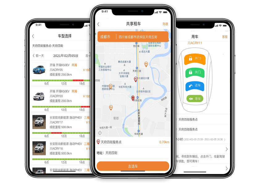 系统包括共享汽车管理,共享汽车管理设备管理,以地图方式在线管理车辆位置,状态等信息,提供用车客户扫码下单,选车预约,手机开门,手机还车等功能,